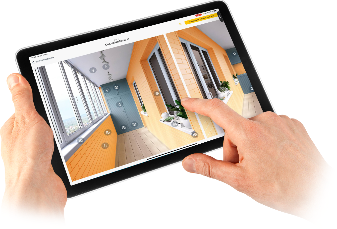 Мы разработали уникальное приложение для iPad, с помощью которого ваши замерщики смогут прямо на замере собрать дизайн балкона, показать различные варианты материалов отделки, встроенной мебели и декора.